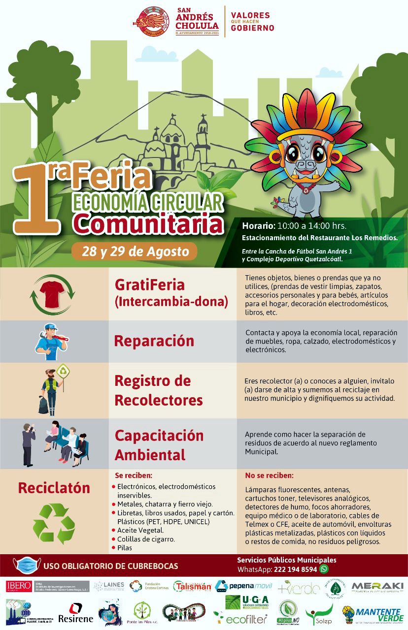 San Andrés Cholula | El próximo sábado 28 y domingo 29 de agosto, el gobierno municipal celebrará la Primera Feria de Economía Circular Comunitaria, en el Estacionamiento del Restaurante Los Remedios, entre la Cancha de Fútbol San Andrés 1 y el Complejo Deportivo Quetzalcóatl, de las 10 a las 14 horas.