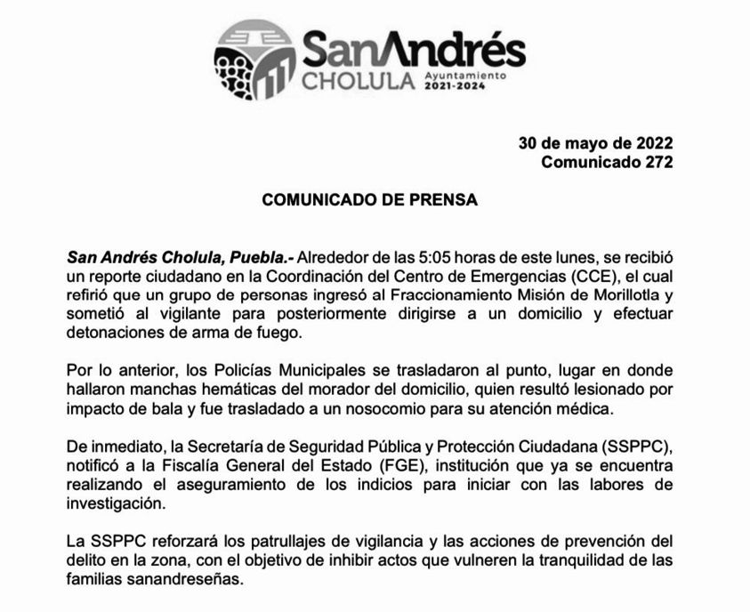 En el comunicado se puntualiza que el ataque se registró alrededor de las 5:05 horas de este lunes, según el reporte de un vecino. Conforme al llamado de auxilio, “un grupo de personas ingresó al fraccionamiento Misión de Morillotla y sometió al vigilante para posteriormente dirigirse a un domicilio y efectuar detonaciones de arma de fuego”.
