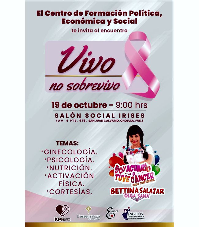 Karina Pérez Popoca, directora del proyecto Caminemos Juntas, anunció el encuentro Vivo No Sobrevivo enfocado a ayudar a personas con enfermedades crónico degenerativas, principalmente cáncer, que se llevará a cabo el próximo miércoles 19 de octubre en el salón Irises de San Pedro Cholula