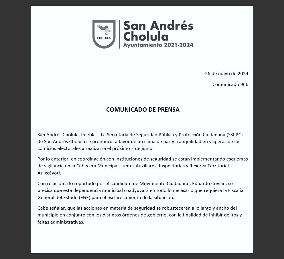 San Andrés Cholula | El reforzamiento de la vigilancia policiaca, en coordinación con autoridades estatales y federales, anunció la Secretaría de Seguridad Pública y Protección Ciudadana (SSPPC), ante la acusación del candidato a la presidencia municipal de Movimiento Ciudadano, Eduardo Covián Carrizales, de presuntas agresiones y amenazas hechas esta mañana a su secretario particular, a una semana de las votaciones.