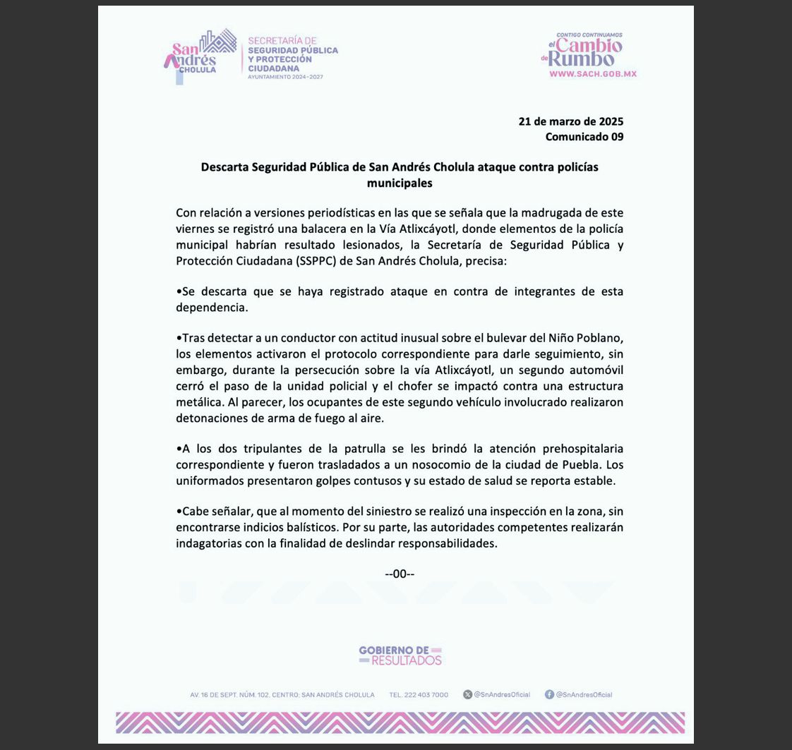Ante las versiones de que se trató de un ataque directo contra los policías municipales, la Secretaría de Seguridad Pública y Protección Ciudadana de San Andrés Cholula aclaró que se trató de un aparente incidente vial