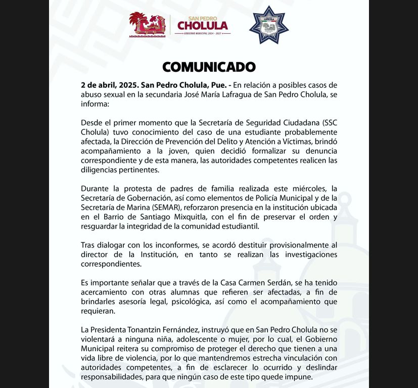 San Pedro Cholula | Personal de la Dirección de Prevención del Delito y Atención a Víctimas brindó acompañamiento a una estudiante de la secundaria José María La Fragua que decidió denunciar formalmente un presunto abuso cometido por un directivo al interior del plantel.