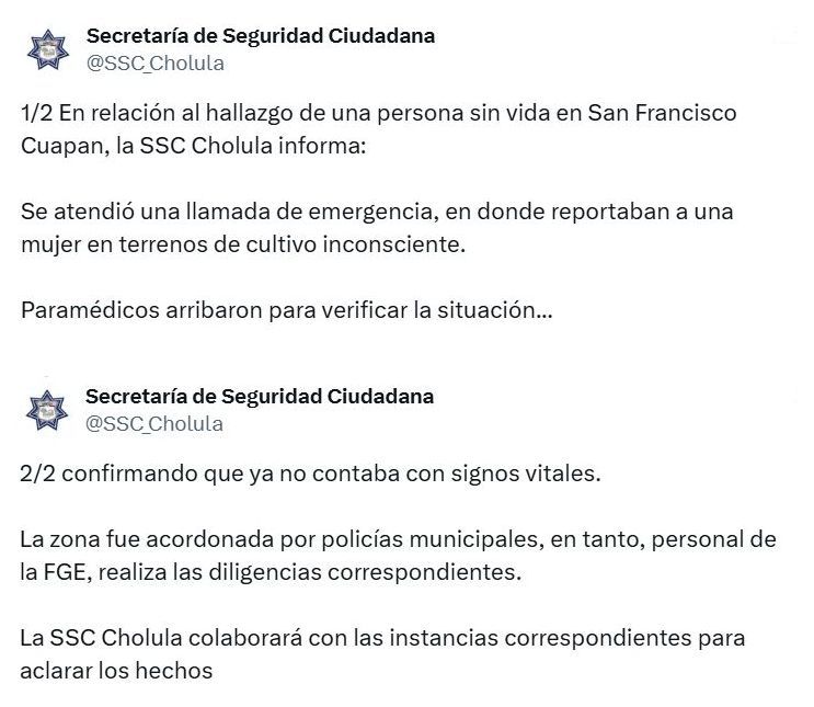 La SSC Cholula indica que colaborará con las instancias correspondientes para aclarar los hechos.
