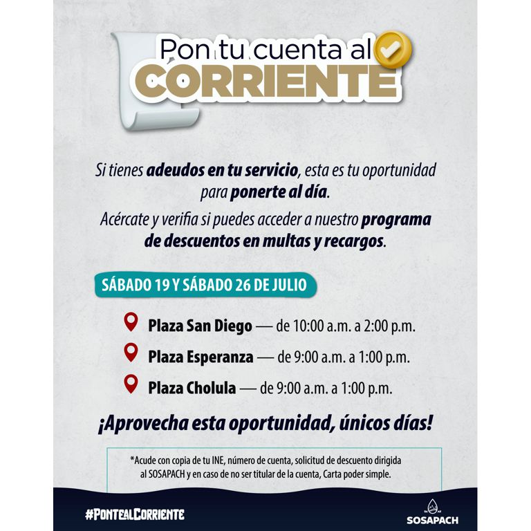 San Pedro Cholula | El Sistema Operador de los Servicios de Agua Potable y Alcantarillado (Sosapach) invita a la ciudadanía a aprovechar el programa de regularización de cuentas Pon tu cuenta al Corriente, a fin de evitar multas y recargos.