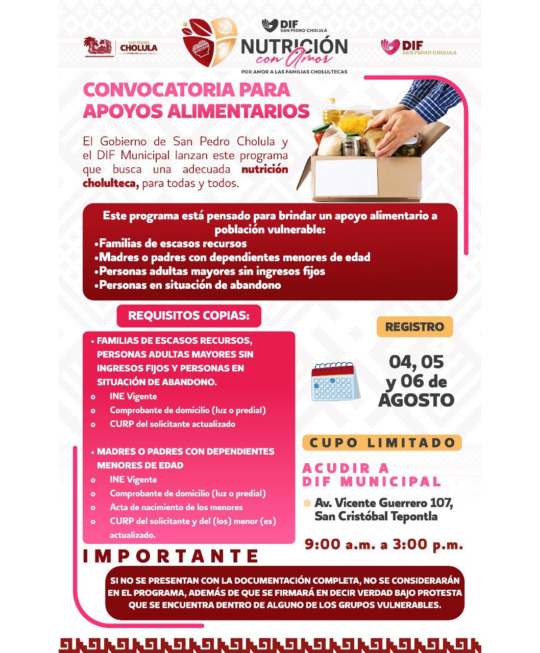 San Pedro Cholula | Al miércoles 6 de agosto, el gobierno municipal amplió el periodo de registro para el programa de apoyos alimentarios Nutrición Con Amor con el objetivo de garantizar mayor cobertura y beneficiar a un mayor número de familias en situación de vulnerabilidad.