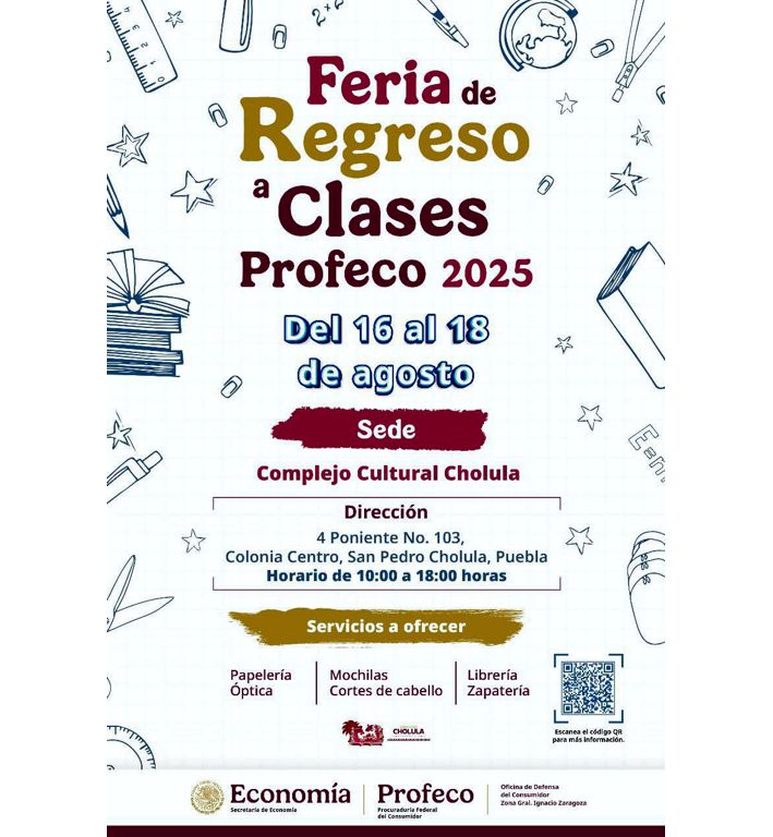Puebla, capital | Del sábado 16 al lunes 18 de agosto se llevará a cabo la Feria de Regreso a Clases 2025 en el Complejo Cultural de San Pedro Cholula con el objetivo de fortalecer la economía familiar ante el inicio del ciclo escolar.