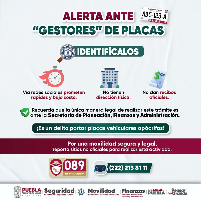 Puebla, capital | La Secretaría de Seguridad Pública (SSP) alerta a la ciudadanía sobre los riesgos de tramitar placas de circulación mediante redes sociales con “gestores o coyotes”.