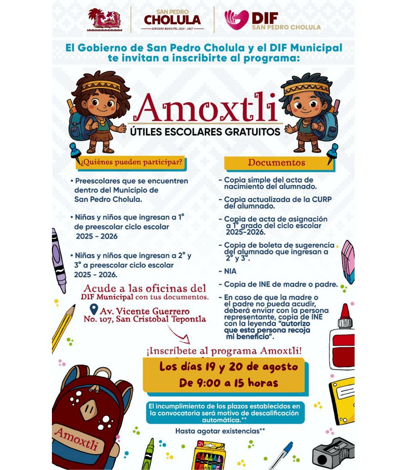 San Pedro Cholula | Hasta el miércoles 20 de agosto, el ayuntamiento y el DIF mantendrán abierto el registro al programa Amoxtli, mediante el que entregarán de manera gratuita paquetes de útiles escolares básicos a niñas y niños de 3 a 7 años que cursen preescolar en instituciones públicas y de los Centros de Atención Infantil Comunitarios (CAIC) de este municipio.
