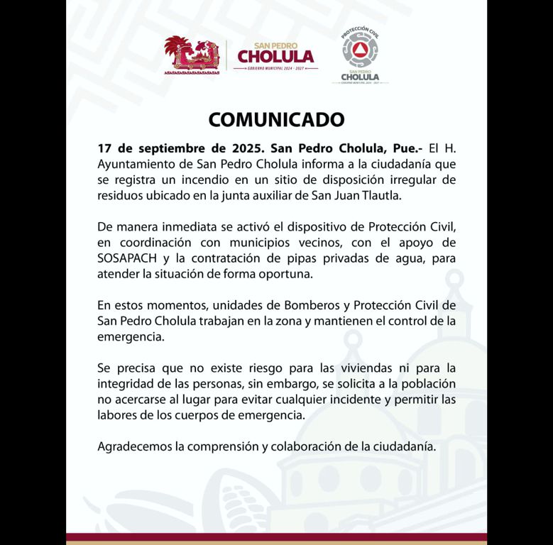 El gobierno de San Pedro Cholula precisa que no existe riesgo para viviendas ni personas; sin embargo, se solicita a la población no acercarse al lugar para evitar cualquier incidente y permitir las labores de las corporaciones de emergencia.