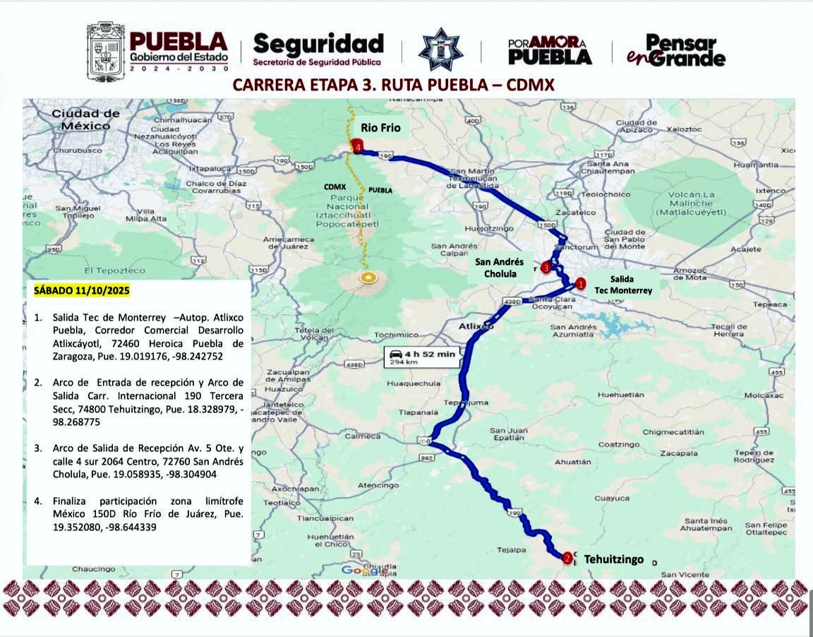 Desde este punto, a unos metros de donde se acondicionan canchas de arena para el Mundial de Voleibol 2025, los corredores partirán alrededor de las tres de la tarde rumbo a la Ciudad de México, pasando por Coronango, San Miguel Xoxtla, Huejotzingo, San Martín Texmelucan, San Matías Tlalancaleca y Tlahuapan.