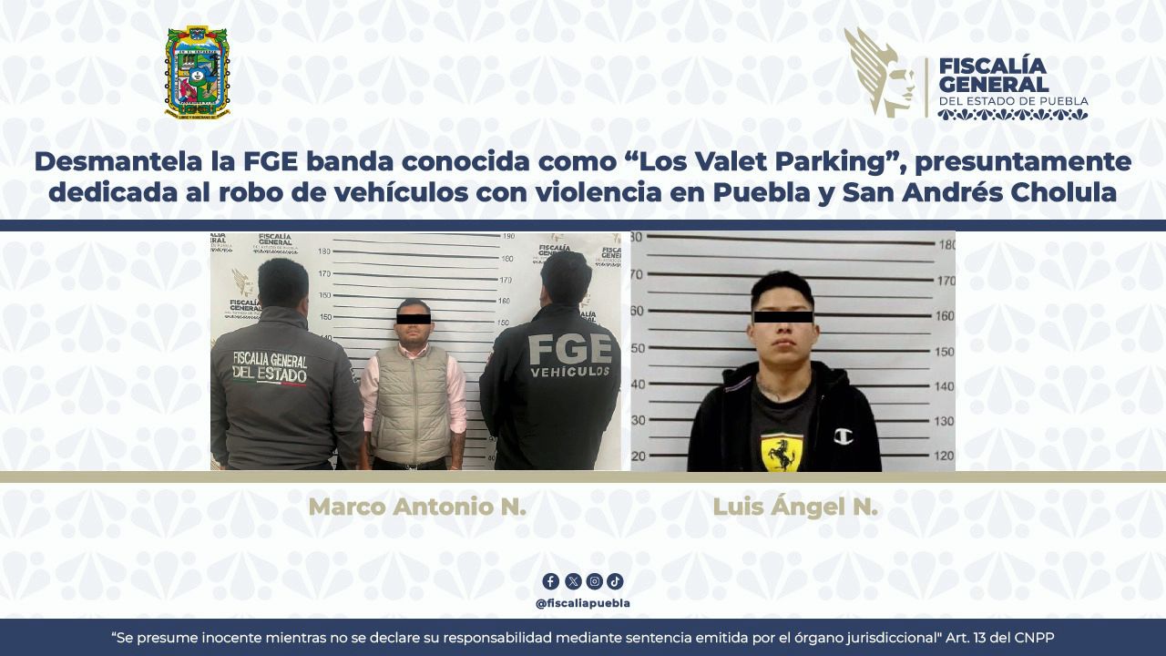 Puebla, capital | Elementos de La Fiscalía General del Estado de Puebla desmantelaron la banda delictiva conocida como “Los Valet Parking”, presuntamente dedicada al robo de vehículos con violencia en los municipios de Puebla y San Andrés Cholula.