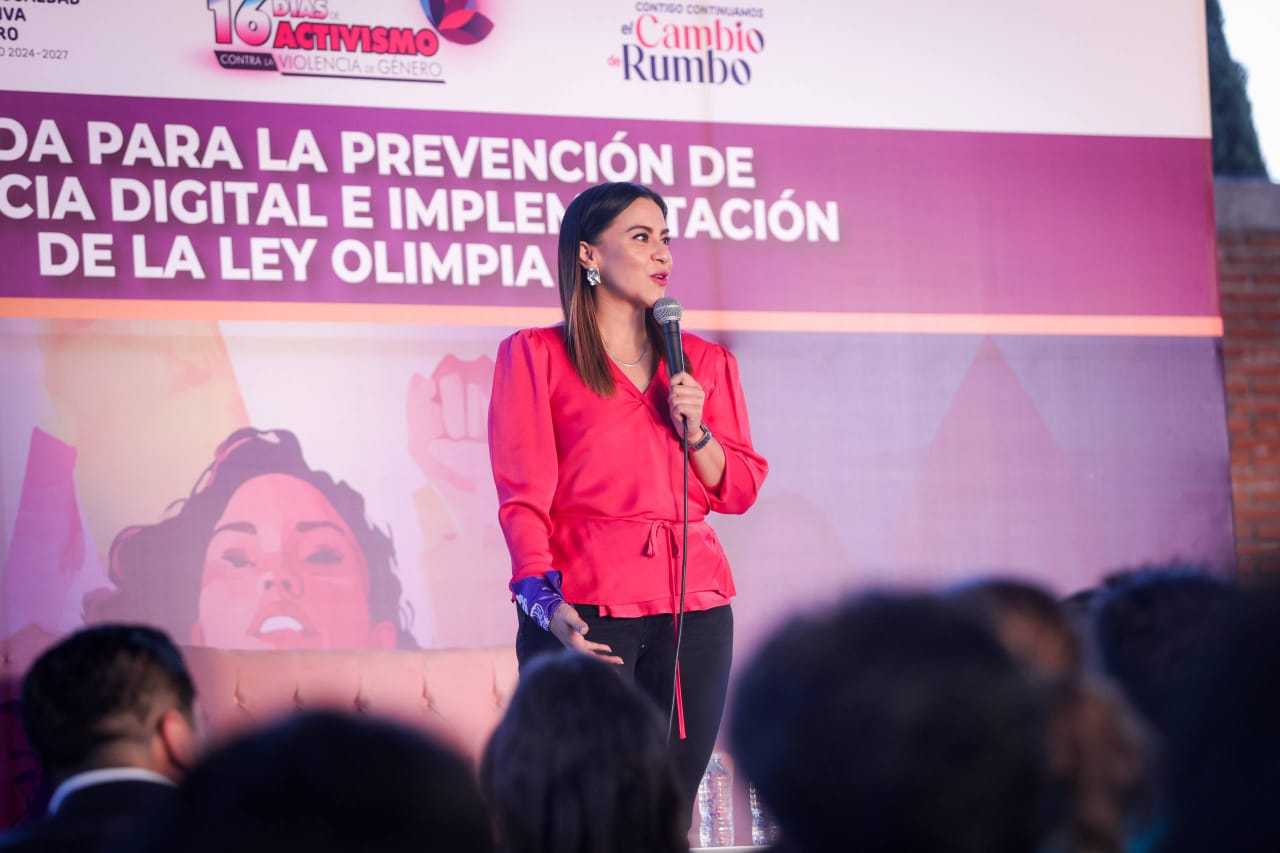 Como parte central de la jornada, Olimpia Coral Melo impartió la conferencia magistral sobre la violencia digital y los alcances de la Ley Olimpia, compartiendo su experiencia personal, el proceso de lucha que impulsó la reforma legal a nivel nacional y las conductas que hoy son sancionadas, como la difusión de contenido íntimo sin consentimiento y el ciberasedio.