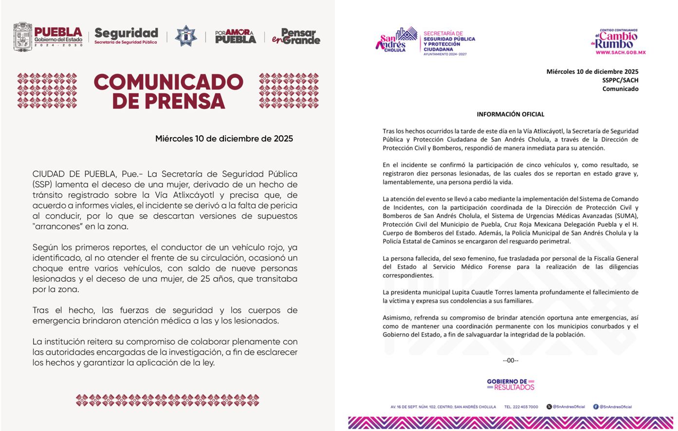 En un comunicado emitido por la SSPPC de San Andrés Cholula, la presidenta municipal, Guadalupe Cuautle Torres, lamentó el fallecimiento de la víctima y expresa condolencias a sus familiares.