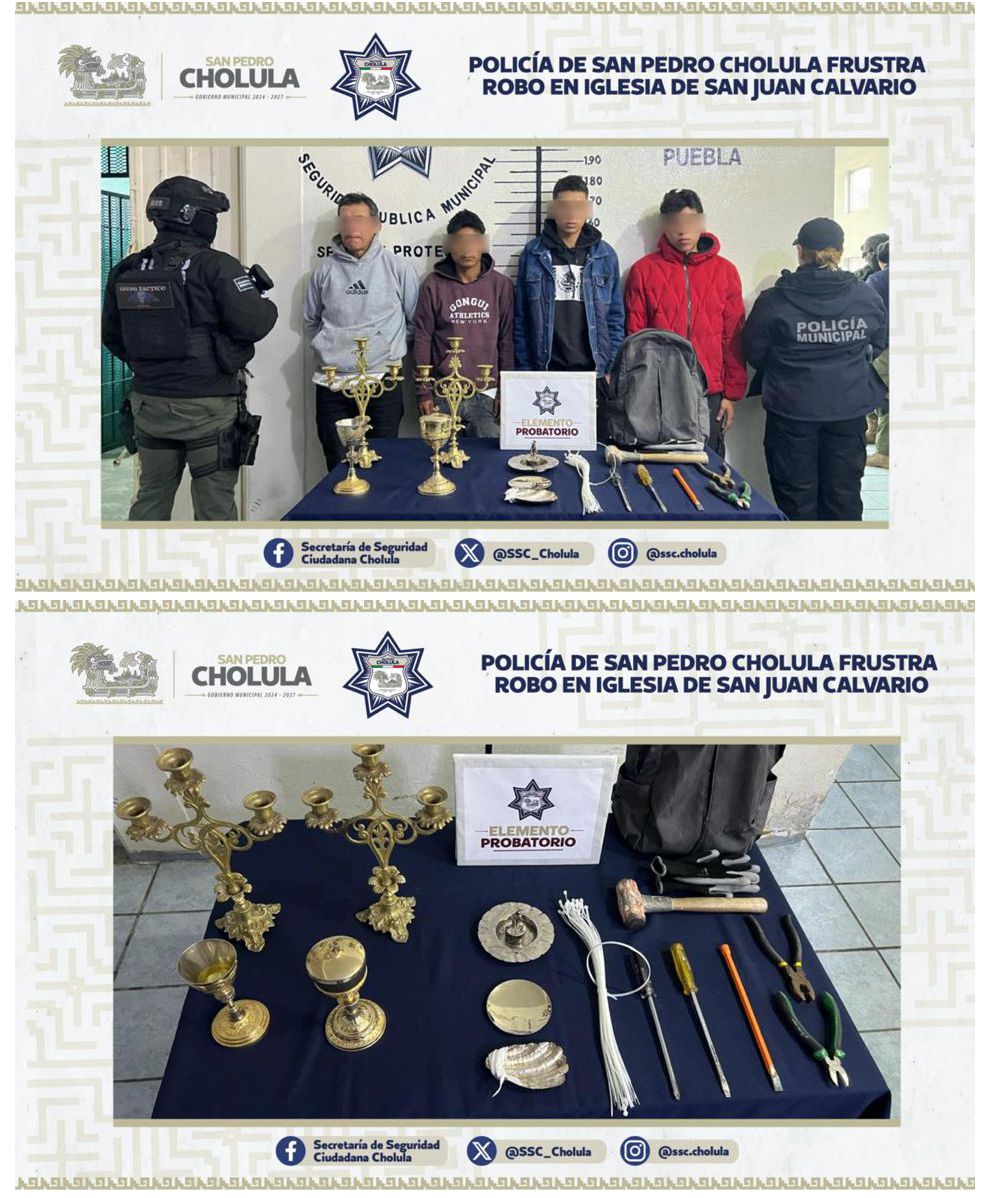 San Pedro Cholula | Policías municipales capturaron a cuatro sujetos que intentaron robar arte sacro de la iglesia del barrio de San Juan Calvario.