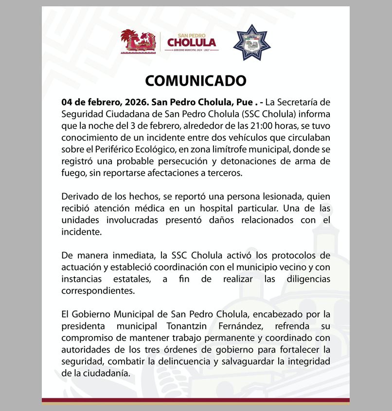 La Secretaría de Seguridad Ciudadana de San Pedro Cholula (SSC Cholula) confirmó que alrededor de las nueve de la noche de ayer recibió información sobre un incidente entre dos vehículos que circulaban sobre el periférico, en zona limítrofe municipal, donde se registró una probable persecución y detonaciones de arma de fuego, sin reportarse afectaciones a terceros.