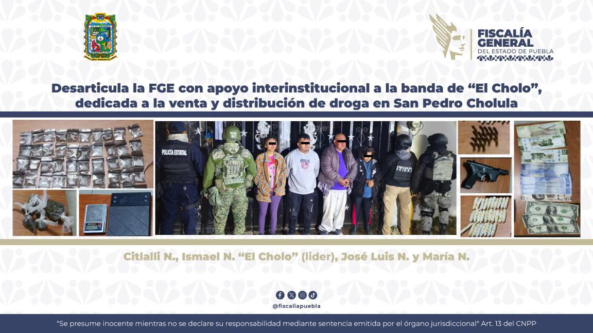 Como resultado de labores de inteligencia y trabajo de campo, la fiscalía con apoyo interinstitucional, detuvo al presunto líder de esta organización y a tres integrantes más que estarían relacionados con la venta y distribución de droga en San Pedro Cholula.