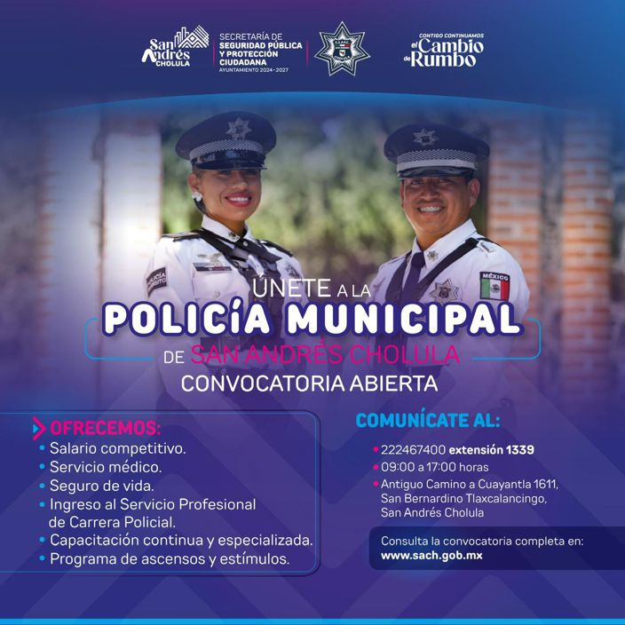 San Andrés Cholula | La Secretaría de Seguridad Pública y Protección Ciudadana (SSPPC) mantiene abierta la convocatoria para la incorporación de nuevos elementos a la Policía Municipal con el propósito de fortalecer las tareas de vigilancia, prevención del delito y proximidad social en el municipio.