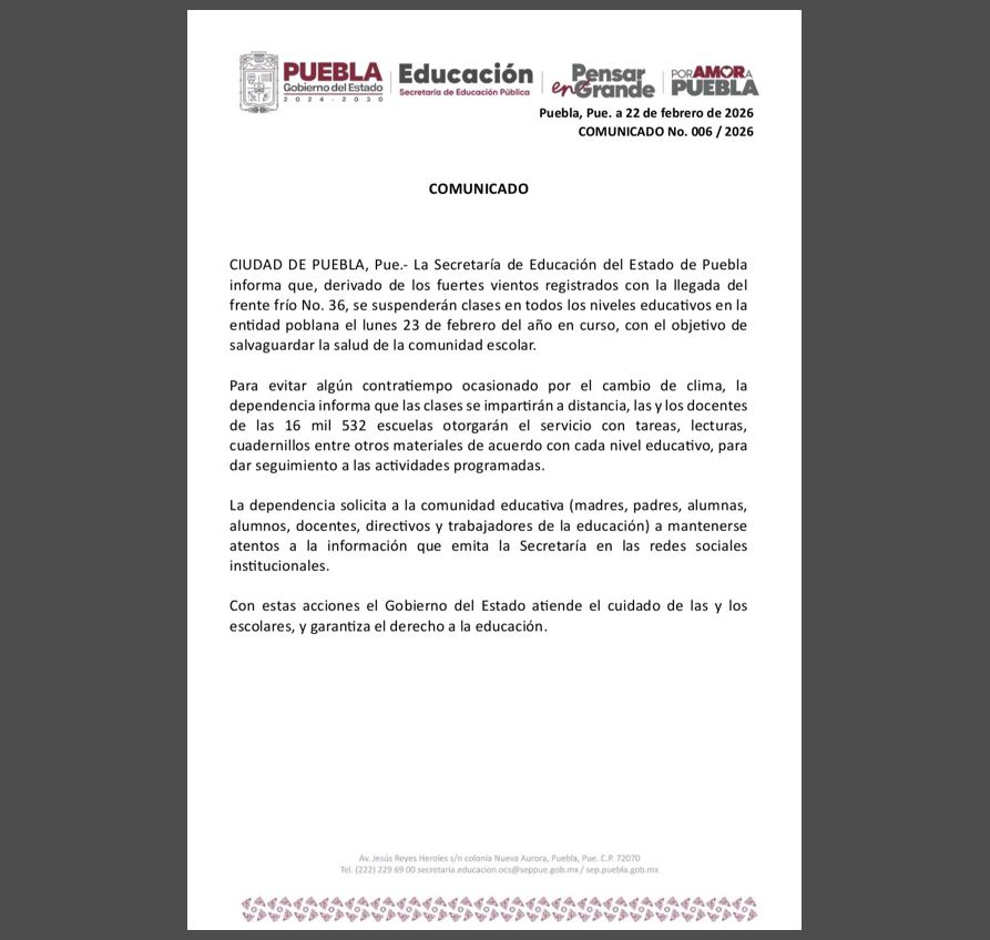 Puebla, capital | Los estudiantes de todos los niveles educativos no tendrán clases presenciales este lunes 23 de febrero, anunció la Secretaría de Educación Pública.