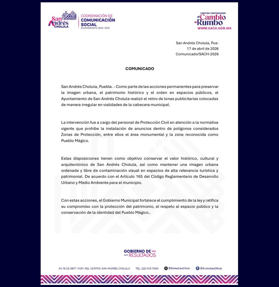 Por su parte, la agrupación Cholultecas Unidos en Resistencia informó que fueron retiradas alrededor de una docena de lonas colocadas por vecinos originarios en la avenida 5 de Mayo, en los cruces de la 4, 8 y 12 Oriente-Poniente.