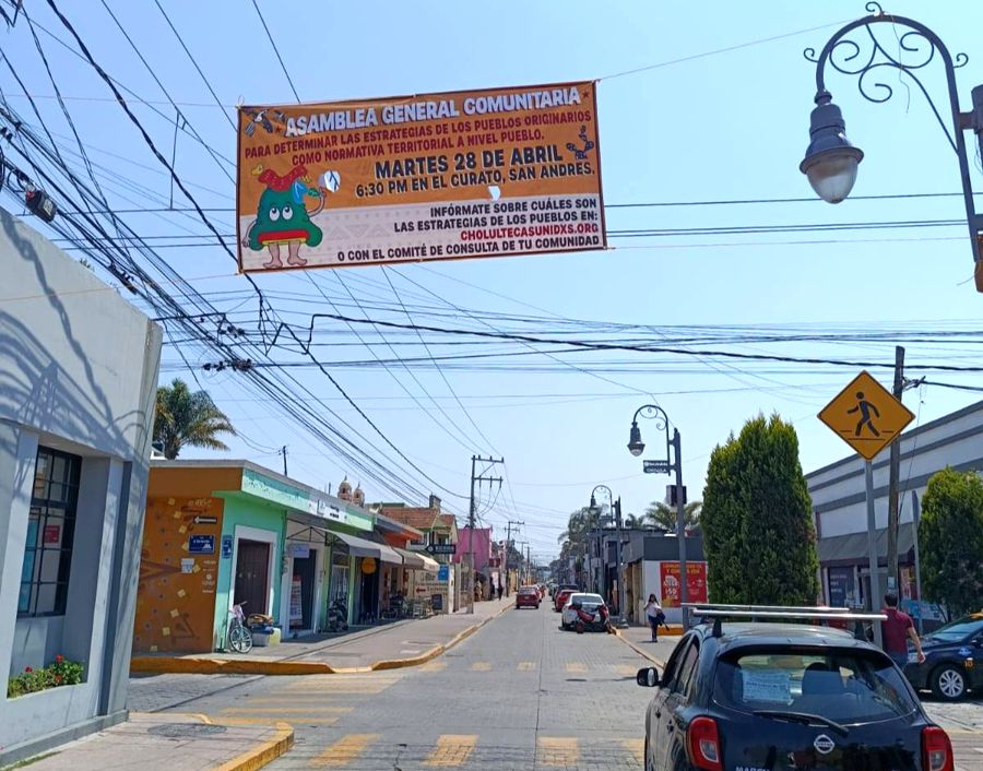 San Pedro Cholula | El ayuntamiento confirmó el retiro de lonas colocadas el miércoles 15 de abril en el centro de la ciudad por la agrupación Cholultecas Unidos en Resistencia para protestar contra el alza de impuestos, la excavación de pozos profundos y la invasión inmobiliaria, así como para convocar a una asamblea la noche del 28 de abril en la parroquia.