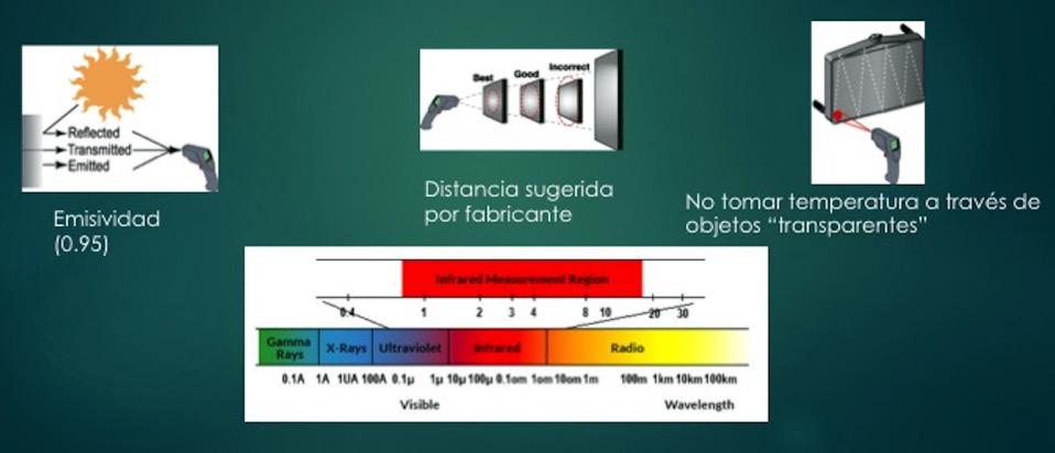 Explicó que todos los cuerpos emiten radiación porque la temperatura está en función del movimiento molecular de los mismos: “Todos los cuerpos tienen moléculas que se están moviendo y esto genera calor. Entonces, con base en el hecho de que todos los cuerpos emiten se hicieron estos termómetros para uso automotriz y para uso eléctrico. Se usan también para monitoreo de fugas de agua: si no se ve la fuga de agua detrás de un muro, con una cámara térmica o con un termómetro se puede hacer una foto térmica o medir puntualmente la pared para ver dónde está la fuga. La teoría detrás de esto es la radiación térmica, pero es una radiación que yo no veo porque mis ojos están diseñados para ver solamente las longitudes de onda en el visible. Tenemos, por supuesto, sensores térmicos en nuestra piel, podemos percibir el calor con la mano, por ejemplo. Todo esto es la teoría detrás de los termómetros térmicos”.
